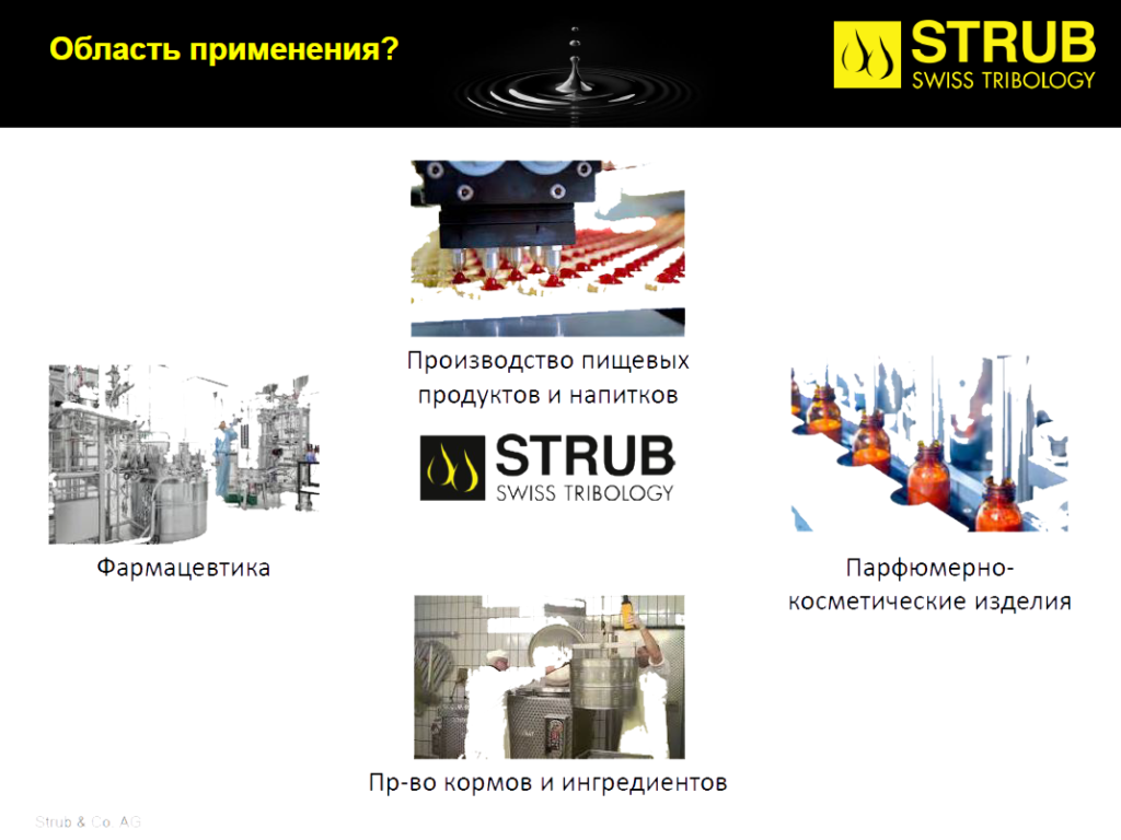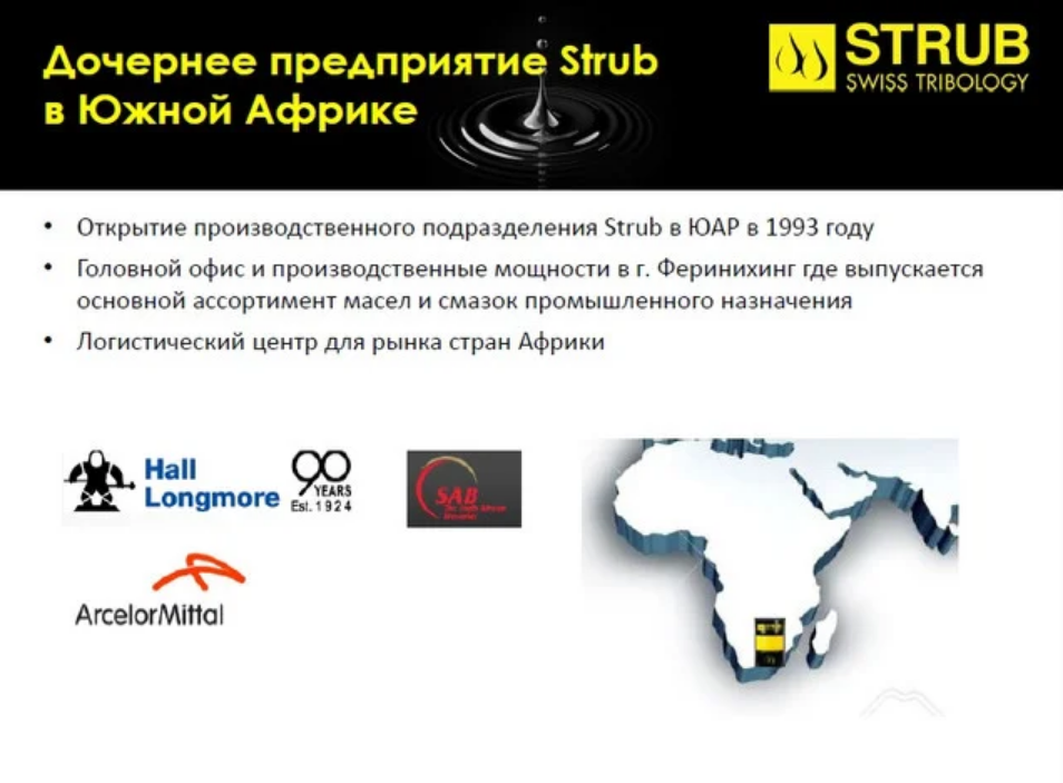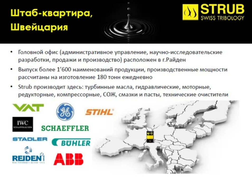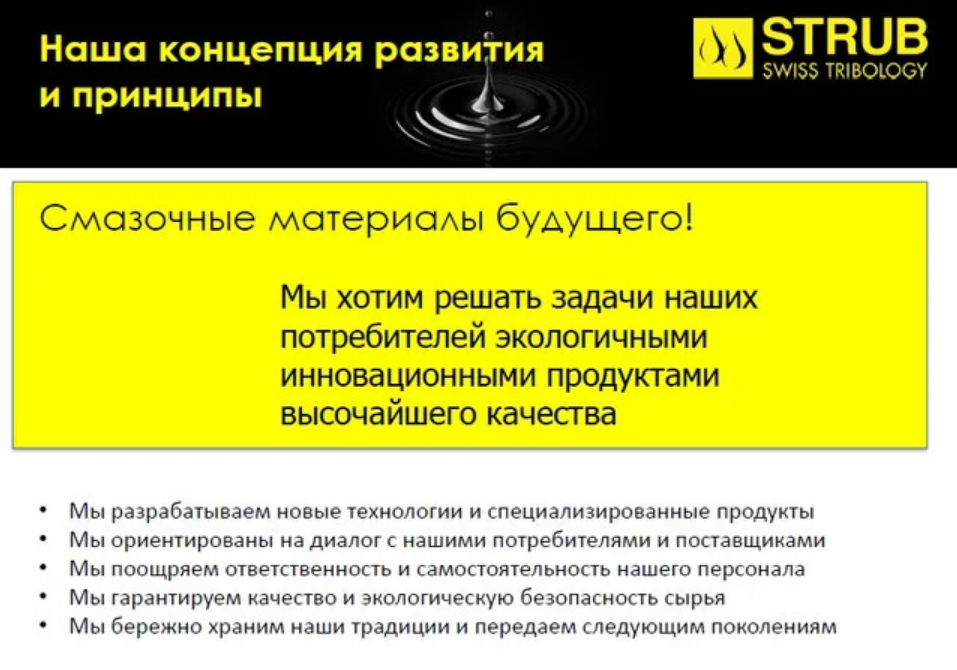 С момента основания в 1921 году, Strub + Co. AG держит курс на качество, экологические свойства продукции и внедрение инновационных решений в области трибологии. Головной офис компании Strub + Co. AG и производственные мощности по выпуску смазочных материалов и технических очистителей расположены в самом сердце Швейцарии.